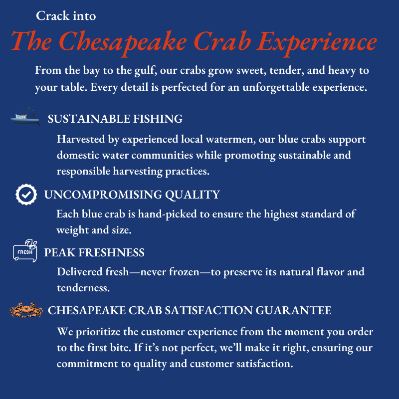 Indulge in the freshest seafood with premium LIVE male blue crabs from Chesapeake Crab Connection. Sourced directly from the pristine waters of the Chesapeake Bay and other top coastal regions, our LIVE male blue crabs are perfect for crab feasts, crab boils, or enjoying a classic seafood dinner. These crabs offer the freshest taste, sweet meat, and tender texture that only live male blue crabs can provide.
